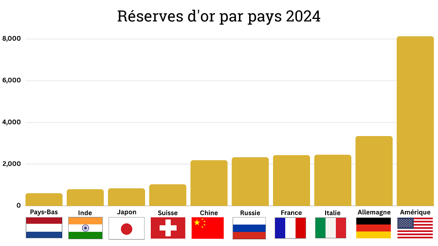 Sans surprise, les États-Unis caracolent en tête avec une réserve colossale de 8 133 tonnes, majoritairement logée dans la légendaire forteresse de Fort Knox. Ils sont suivis par un trio européen : l’Allemagne (3 351 t), l’Italie (2 451 t) et la France (2 437 t), démontrant l’ancrage historique de l’or dans la construction monétaire du Vieux Continent.