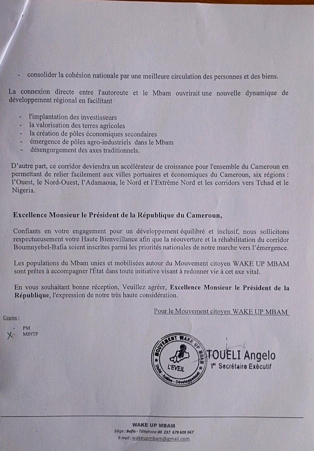 La lettre du mouvement Wake Up Mbam dont le premier secrétaire exécutif est Angelo Touéli, adressée à Paul Biya, est d’une correction confondante. D’une politesse désarmante. Presque obséquieuse. On y parle de « Haute Bienveillance ». Mais de quelle bienveillance parle-t-on, Excellence, quand, sous vos mandats successifs – aussi longs que le corridor Boumnyebel-Bafia est court en considération – tout un peuple est condamné à l’asphyxie économique ?